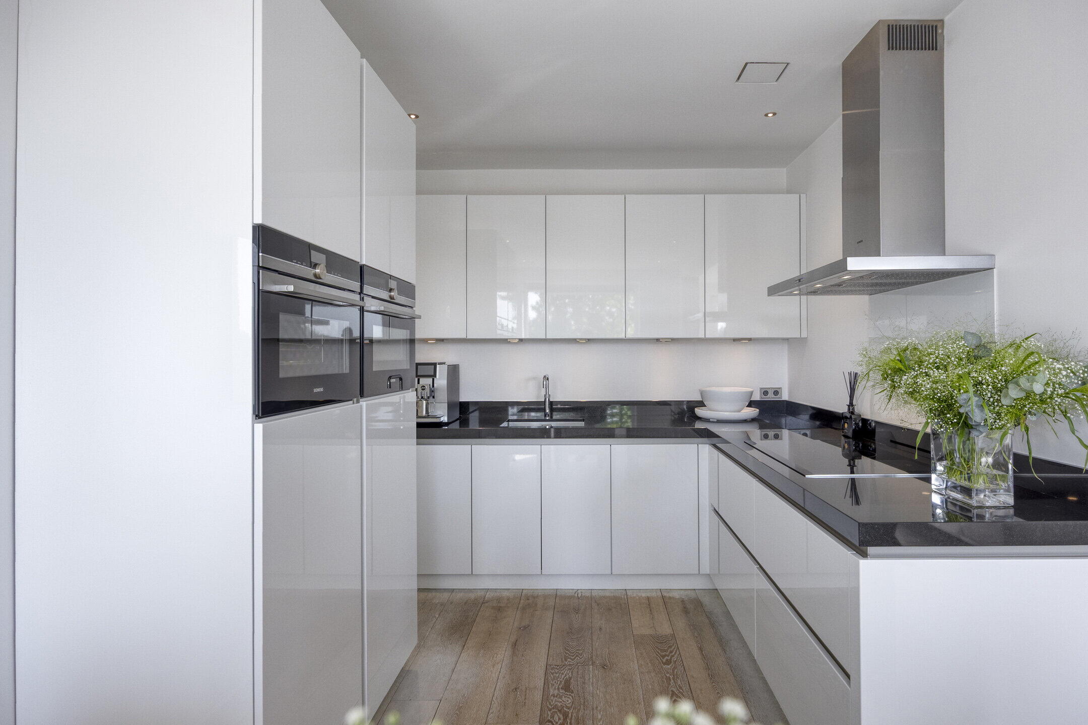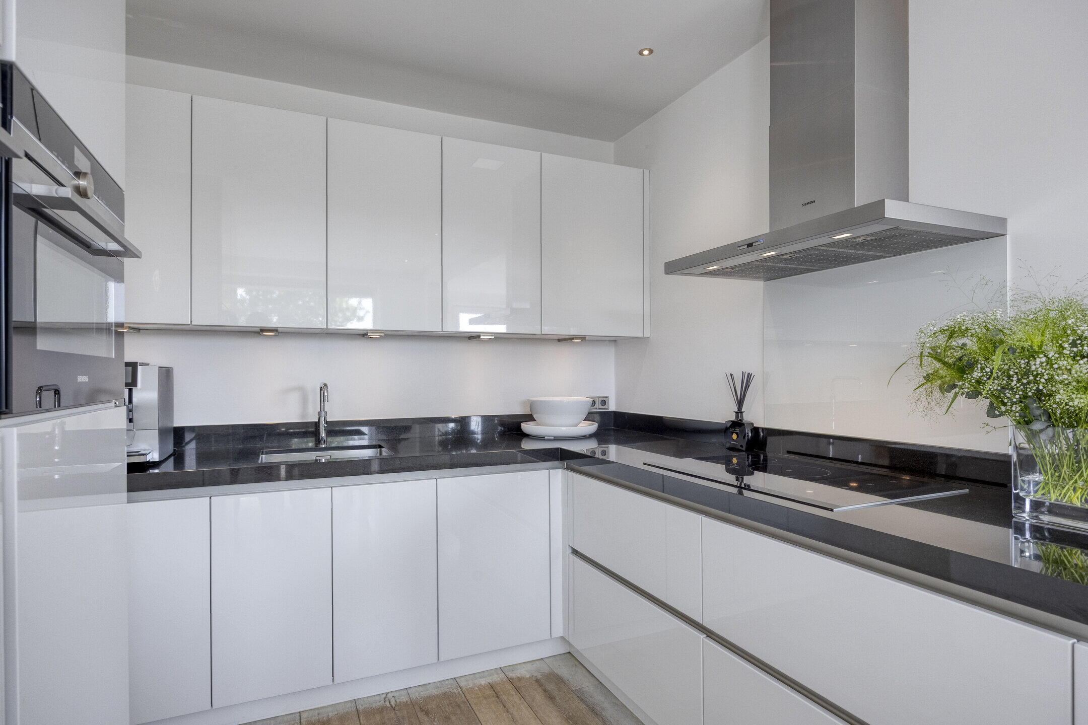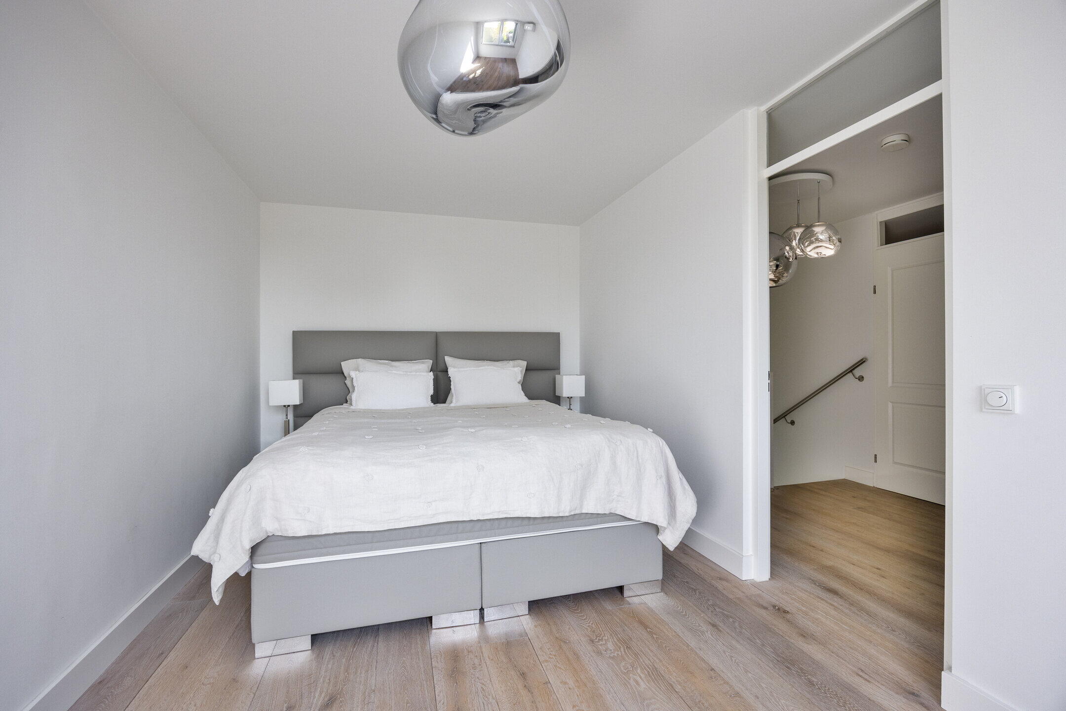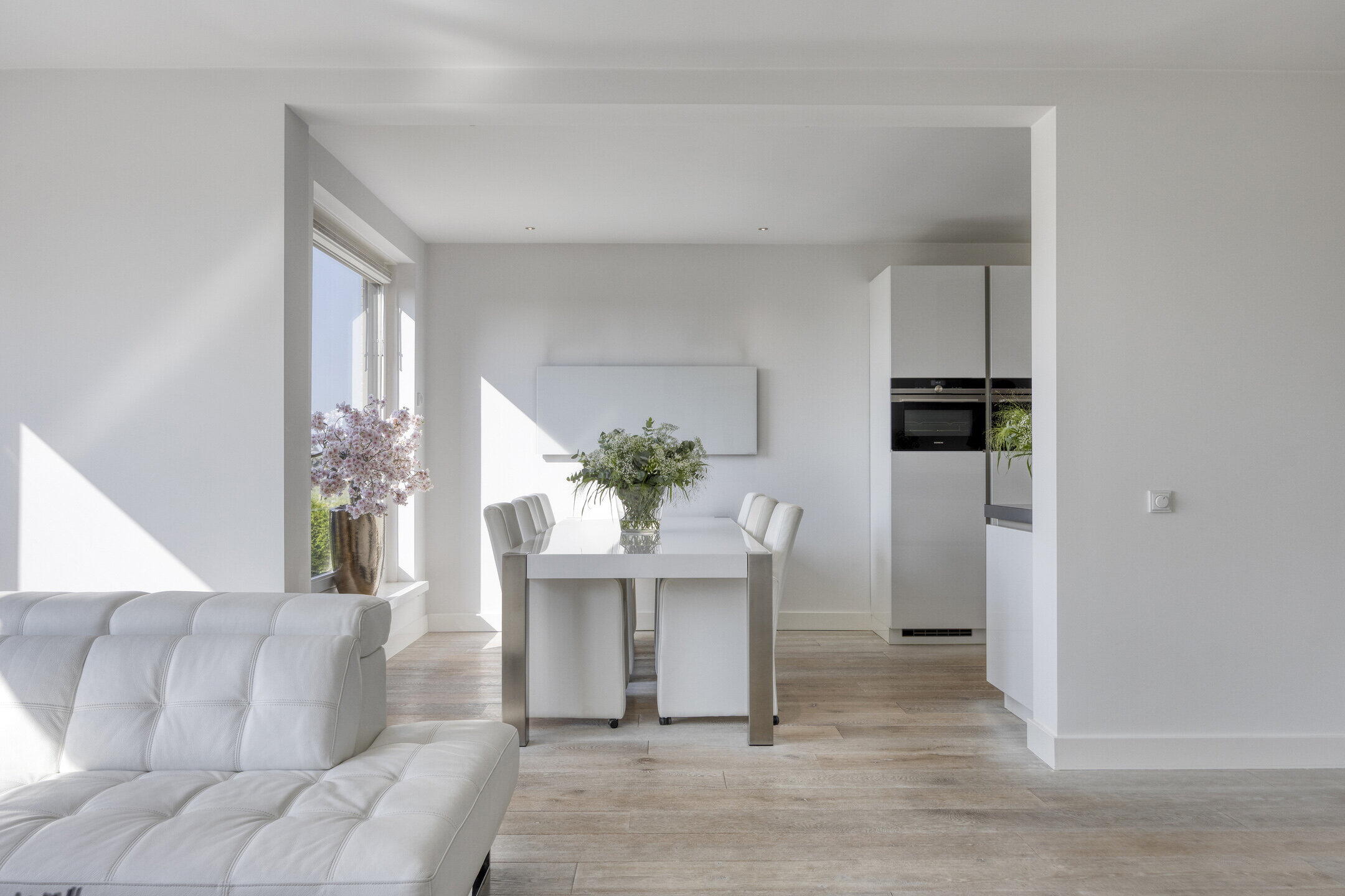 Op de eerste verdieping vind je een royale, lichte woonkamer met houten vloer en strak gestucte witte muren. Screens en een zonnescherm zorgen hier voor een aangenaam binnenklimaat. De palletkachel zorgt voor een warme sfeer op koude dagen. Daarnaast is de woonkamer voorzien van infraroodverwarming. Via de woonkamer bereik je een gang met toilet en een praktische berging met aansluitingen voor wasmachine en droger. De moderne, open keuken is uitgevoerd in wit en voorzien van luxe inbouwapparatuur zoals een inductiekookplaat, Quooker, oven/magnetron, stoomoven, inbouwkoelkast en inbouwvriezer. Dankzij de open indeling blijf je tijdens het koken altijd in contact met je gasten.