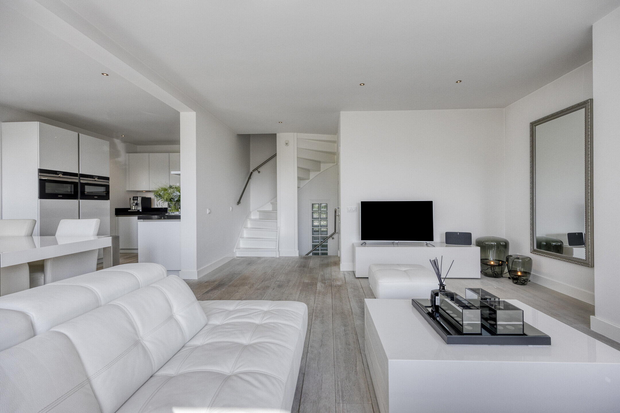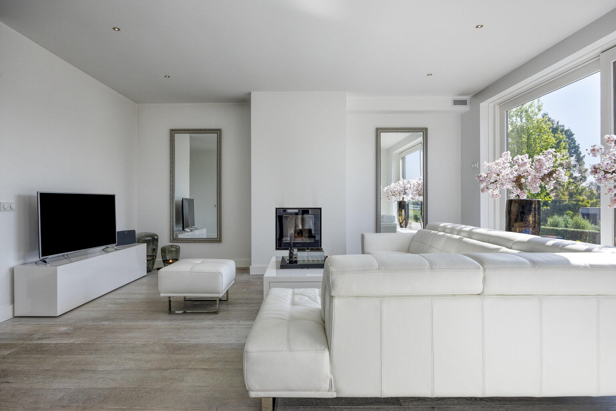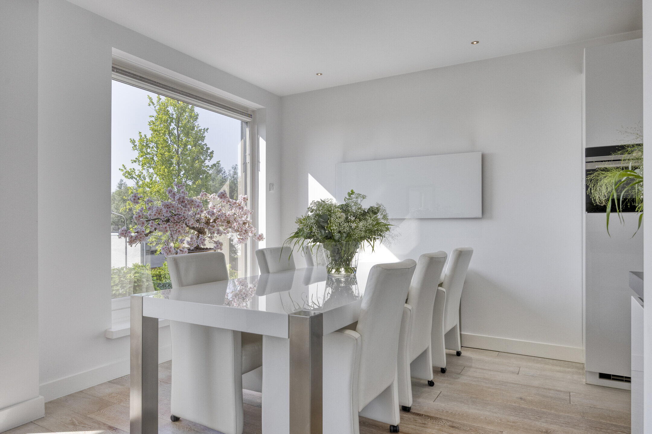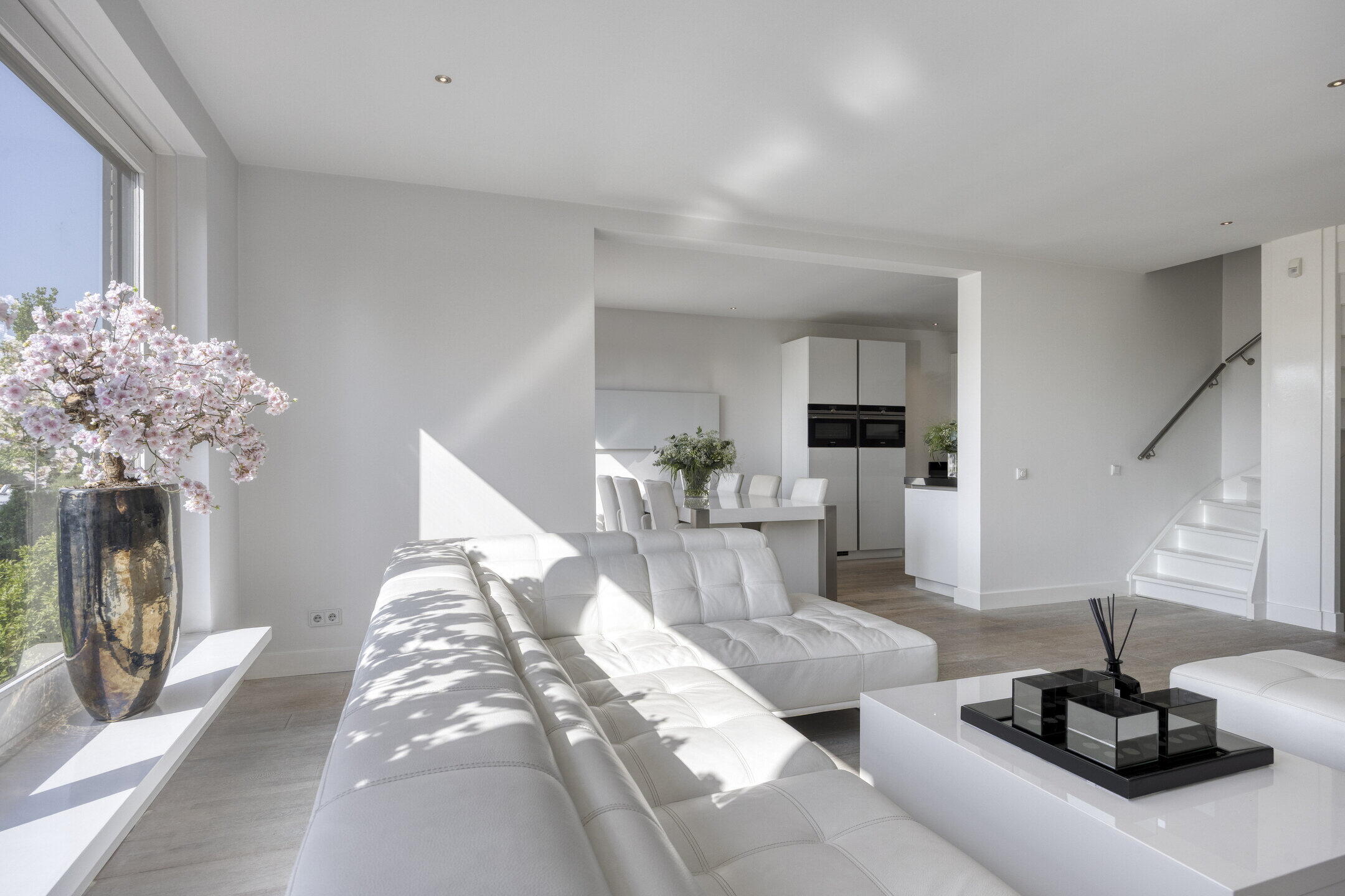 Op de eerste verdieping vind je een royale, lichte woonkamer met houten vloer en strak gestucte witte muren. Screens en een zonnescherm zorgen hier voor een aangenaam binnenklimaat. De palletkachel zorgt voor een warme sfeer op koude dagen. Daarnaast is de woonkamer voorzien van infraroodverwarming. Via de woonkamer bereik je een gang met toilet en een praktische berging met aansluitingen voor wasmachine en droger. De moderne, open keuken is uitgevoerd in wit en voorzien van luxe inbouwapparatuur zoals een inductiekookplaat, Quooker, oven/magnetron, stoomoven, inbouwkoelkast en inbouwvriezer. Dankzij de open indeling blijf je tijdens het koken altijd in contact met je gasten.