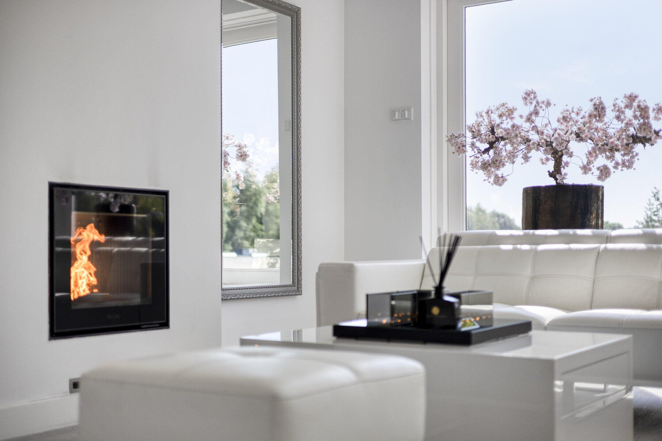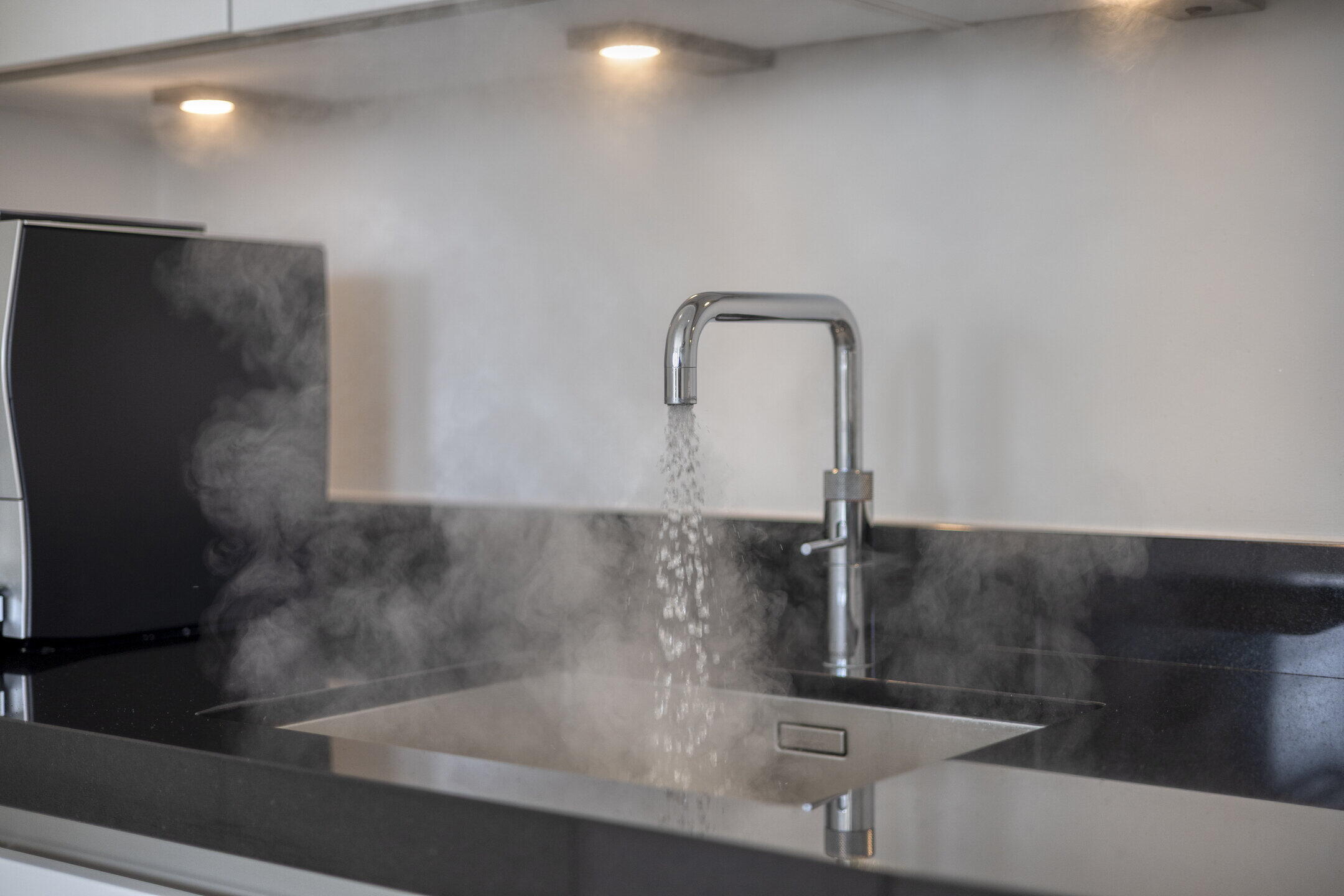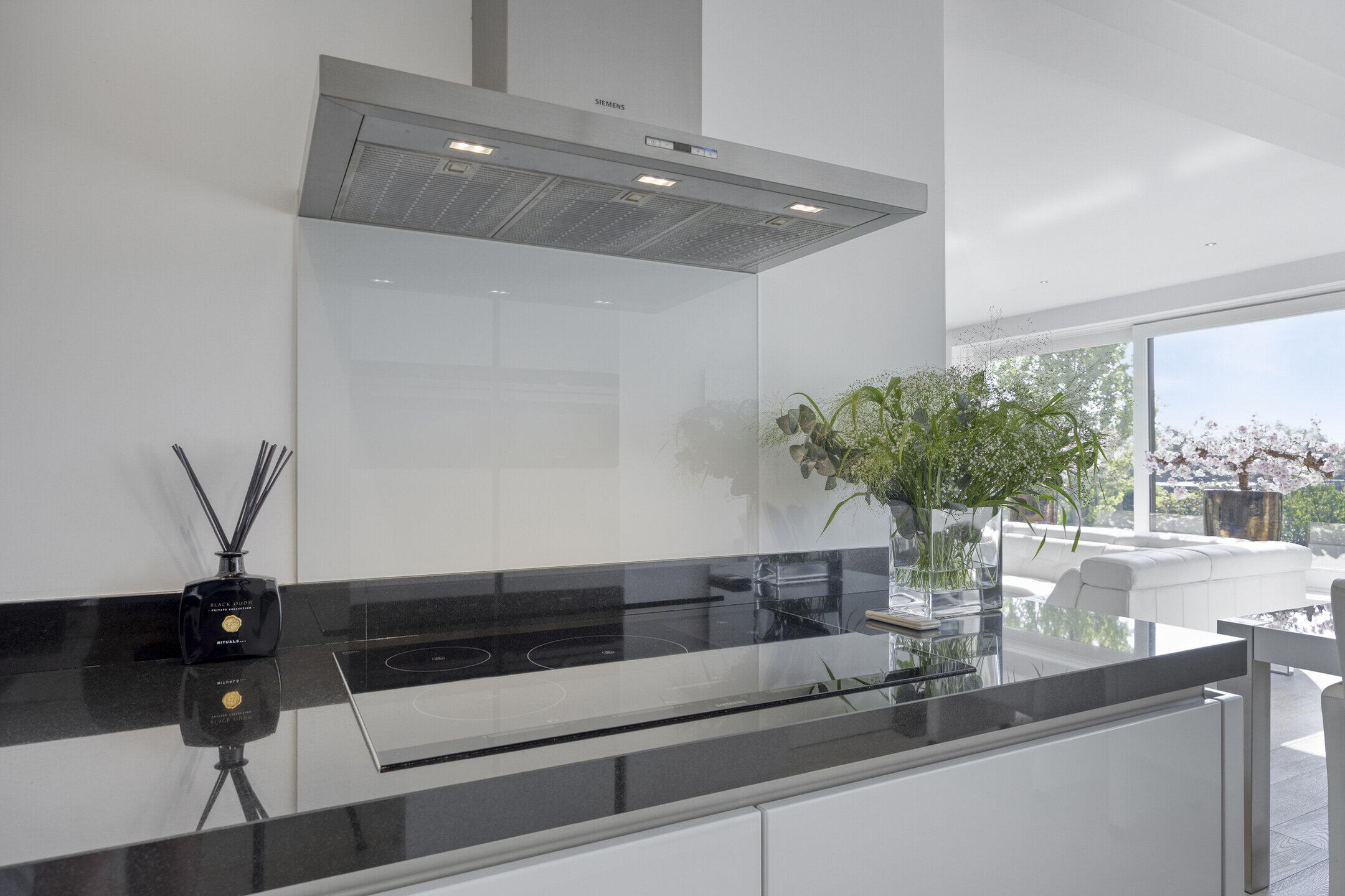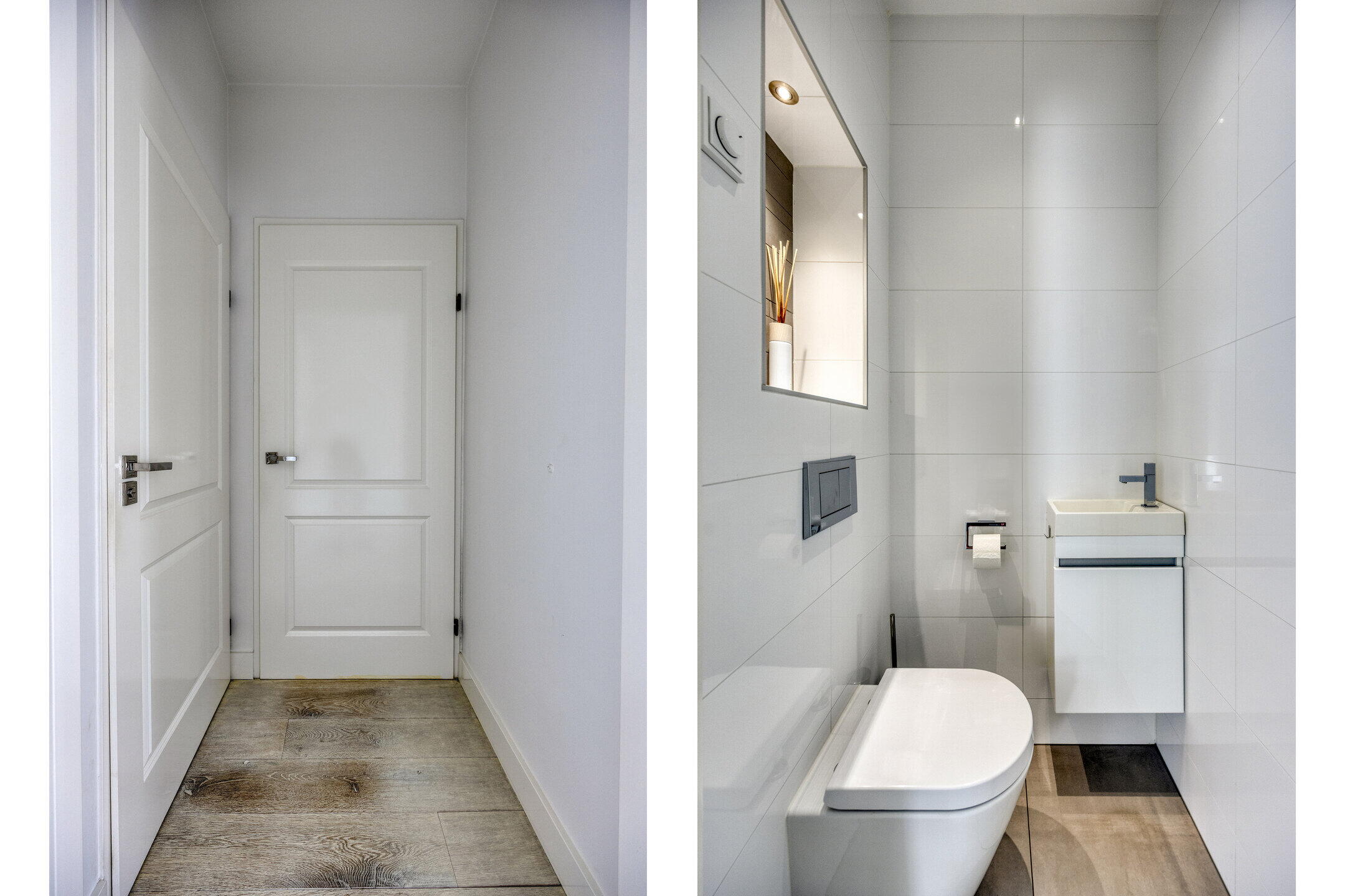 Op de eerste verdieping vind je een royale, lichte woonkamer met houten vloer en strak gestucte witte muren. Screens en een zonnescherm zorgen hier voor een aangenaam binnenklimaat. De palletkachel zorgt voor een warme sfeer op koude dagen. Daarnaast is de woonkamer voorzien van infraroodverwarming. Via de woonkamer bereik je een gang met toilet en een praktische berging met aansluitingen voor wasmachine en droger. De moderne, open keuken is uitgevoerd in wit en voorzien van luxe inbouwapparatuur zoals een inductiekookplaat, Quooker, oven/magnetron, stoomoven, inbouwkoelkast en inbouwvriezer. Dankzij de open indeling blijf je tijdens het koken altijd in contact met je gasten.