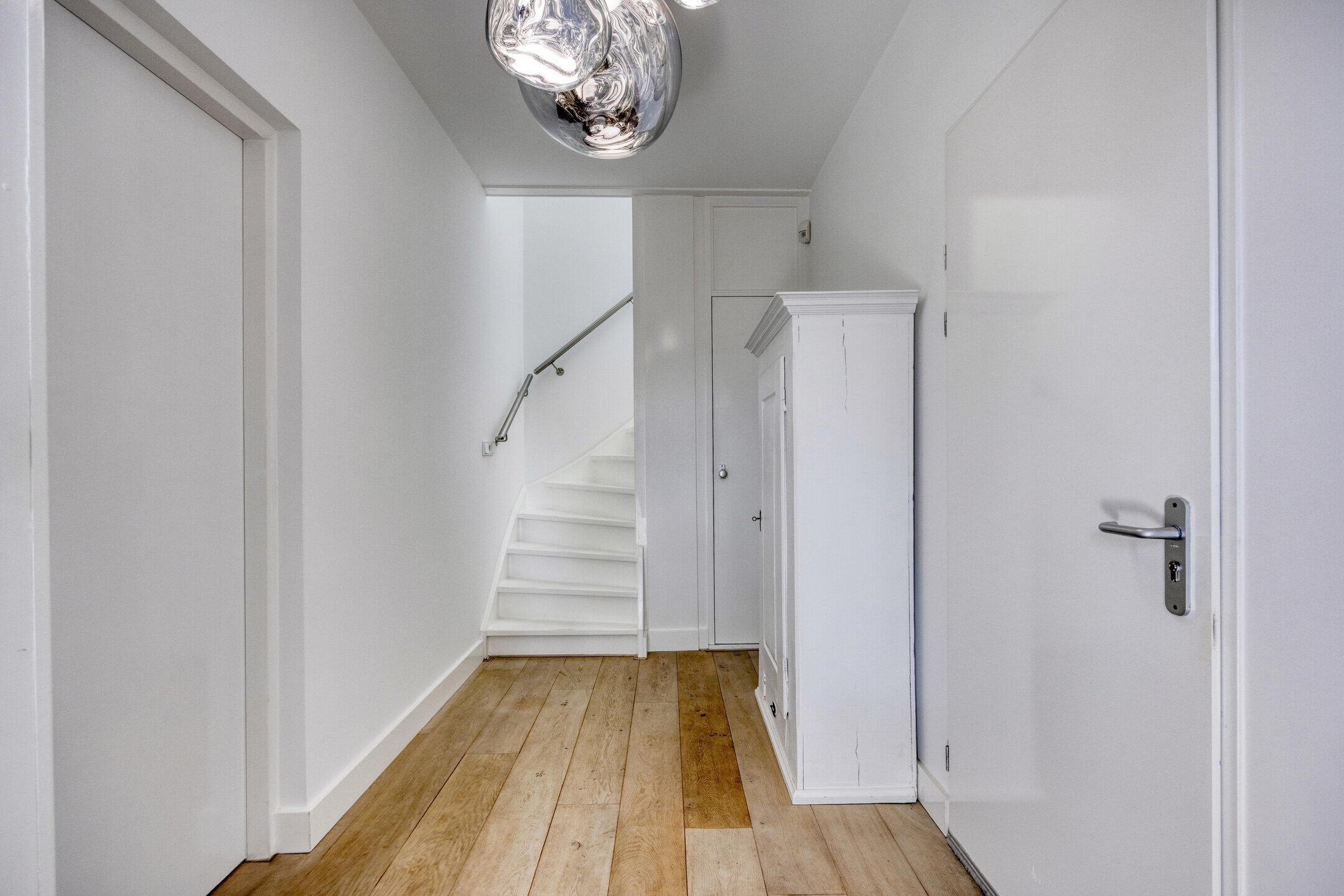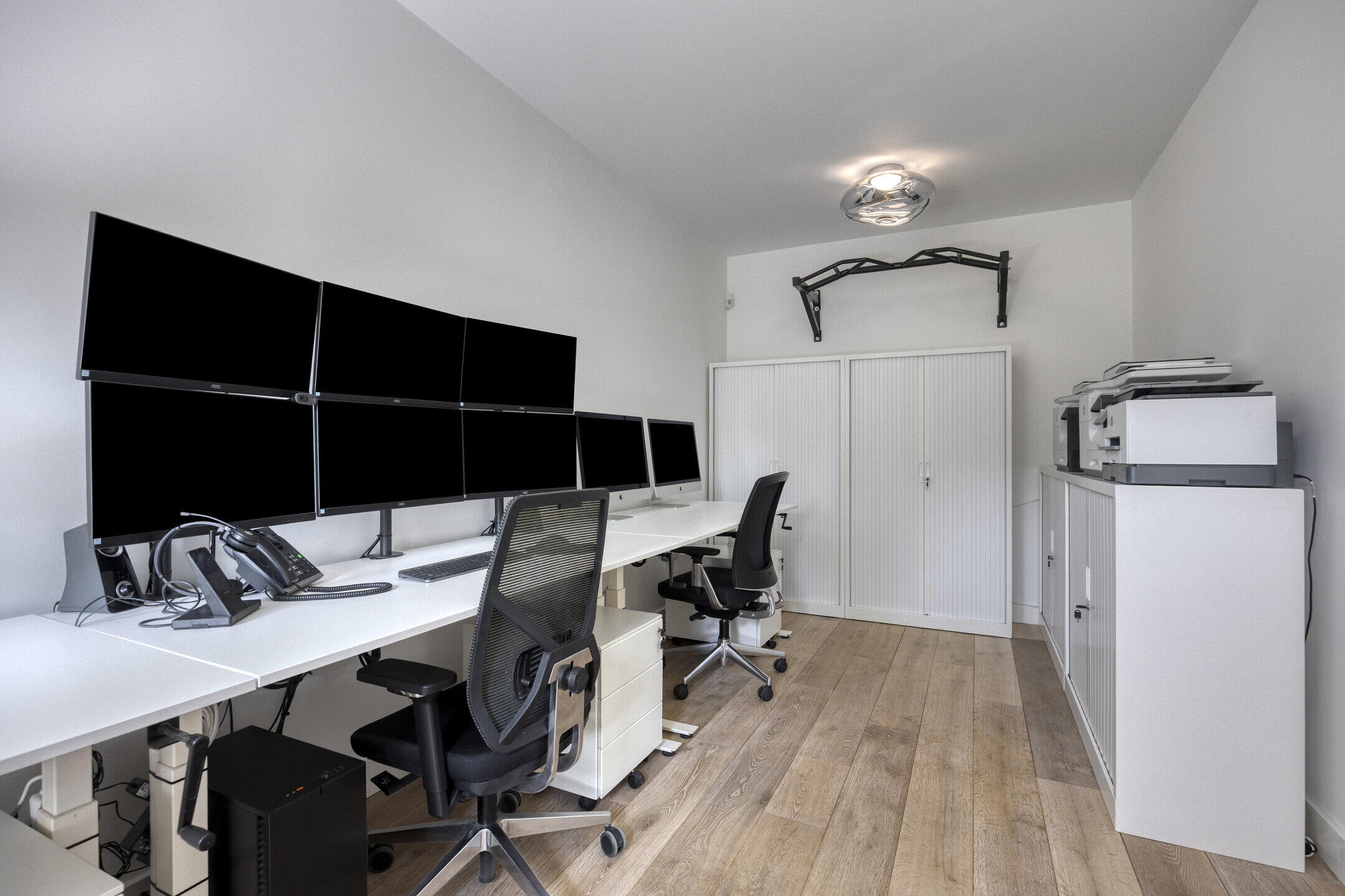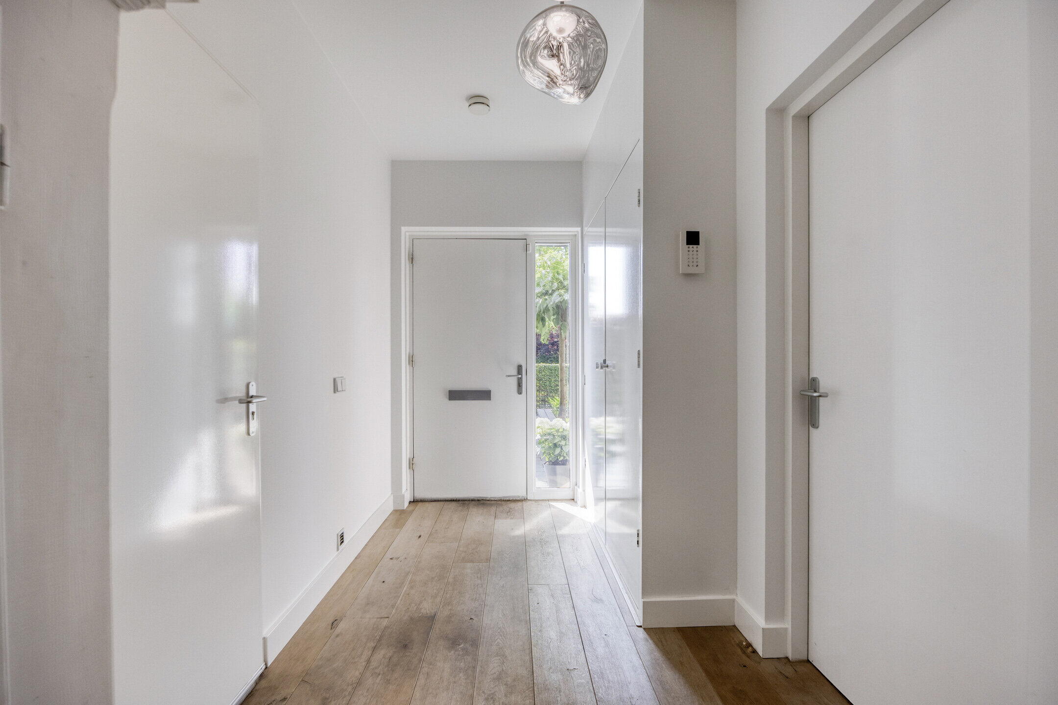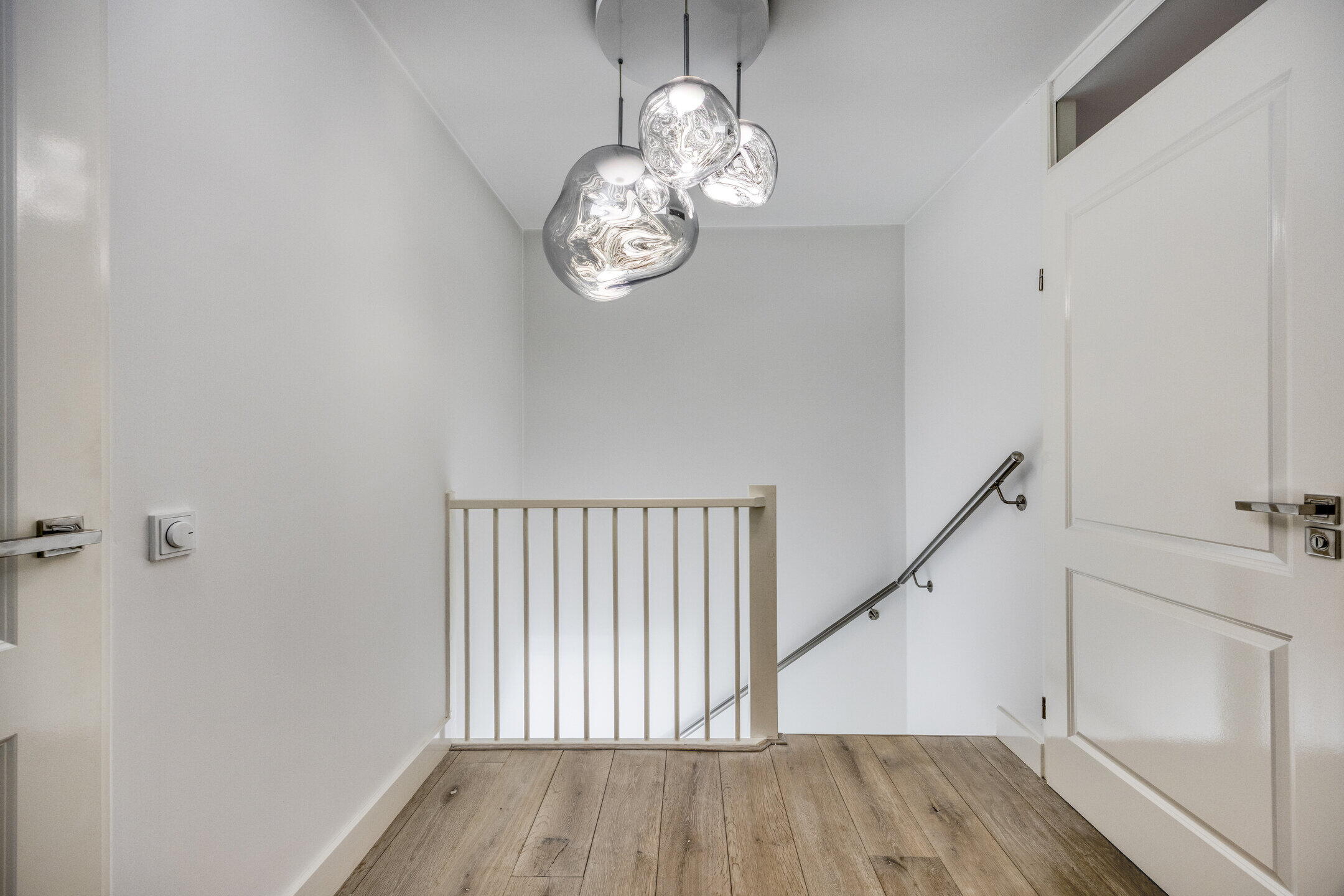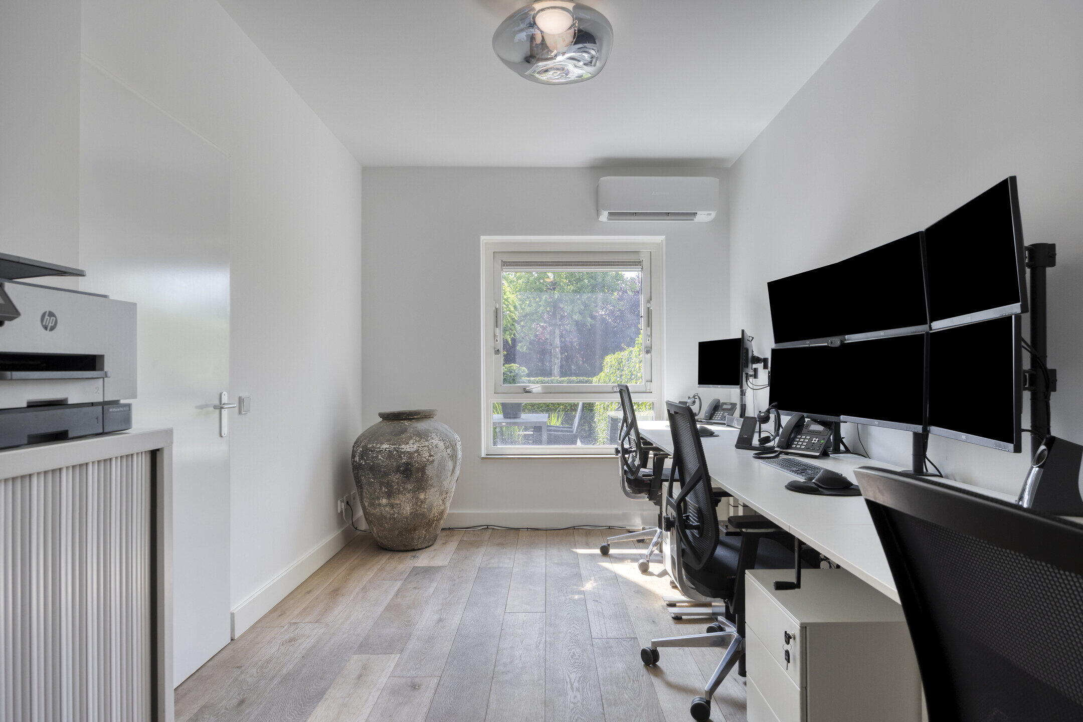 Parkeren kan eenvoudig op de oprit of in de garage met elektrische deur. De hal maakt meteen indruk met frisse witte muren en een warme houten vloer. Vanuit hier heb je toegang tot de garage én een lichte kantoorruimte aan huis, voorzien van airconditioning, ideaal voor thuiswerken. De begane grond en 1e verdieping hebben thermofolie op alle ramen, wat in de winter de warmte binnenhoudt en in de zomer buiten. De gang geeft toegang tot de trap naar de eerste verdieping.