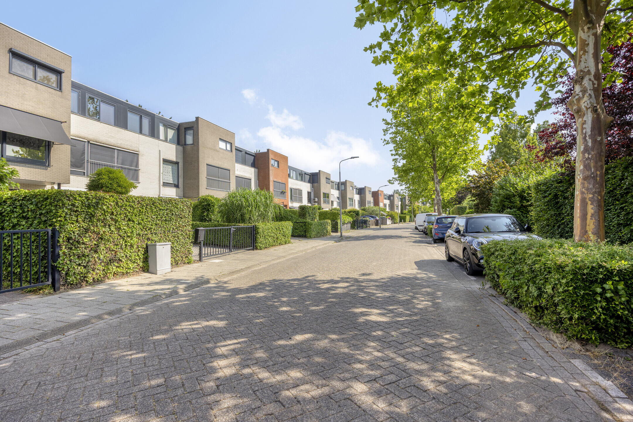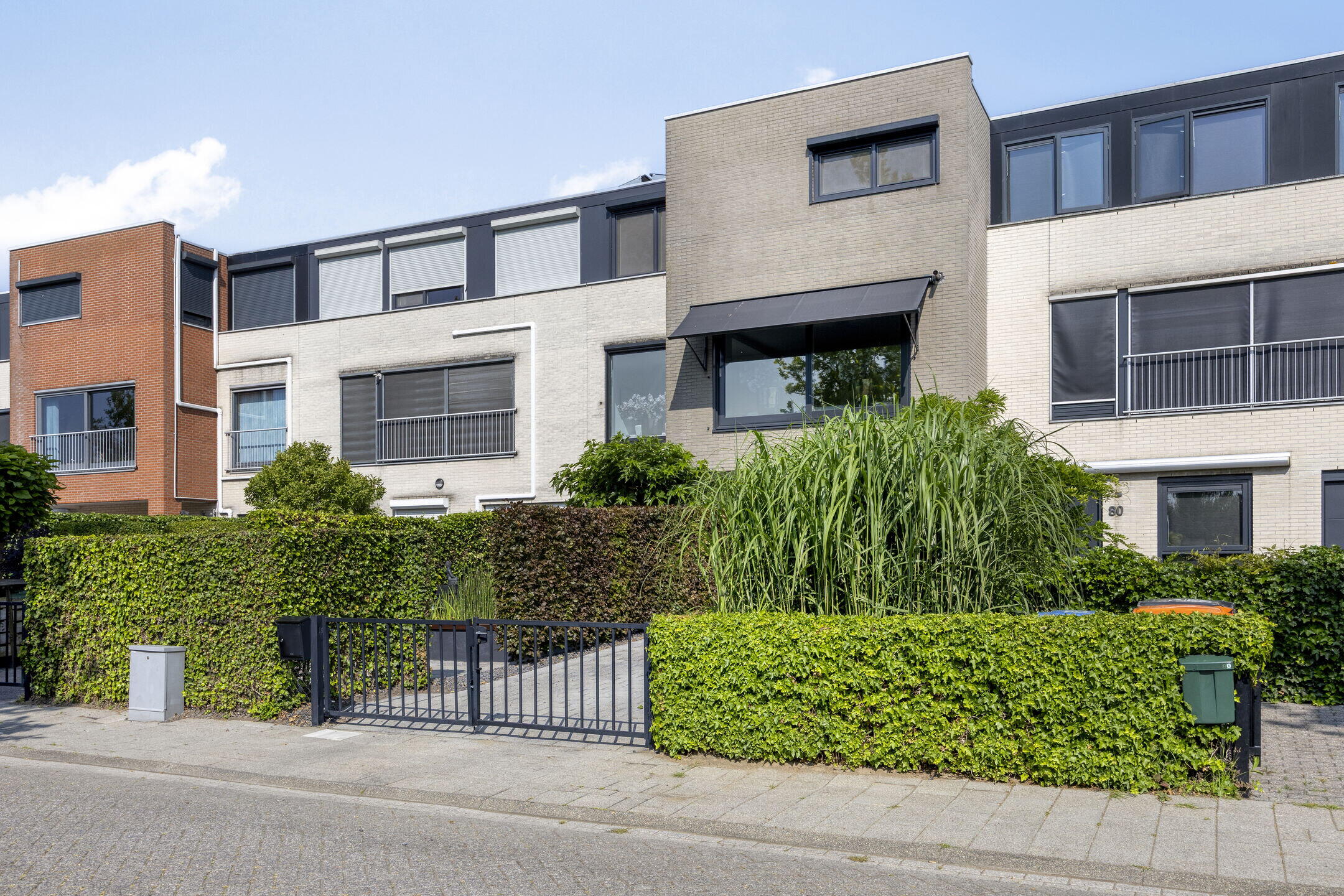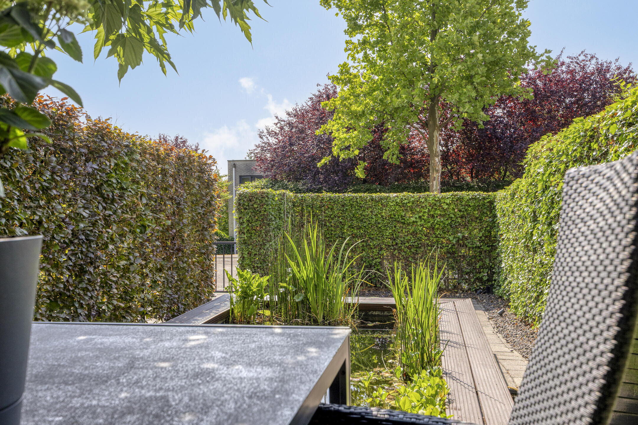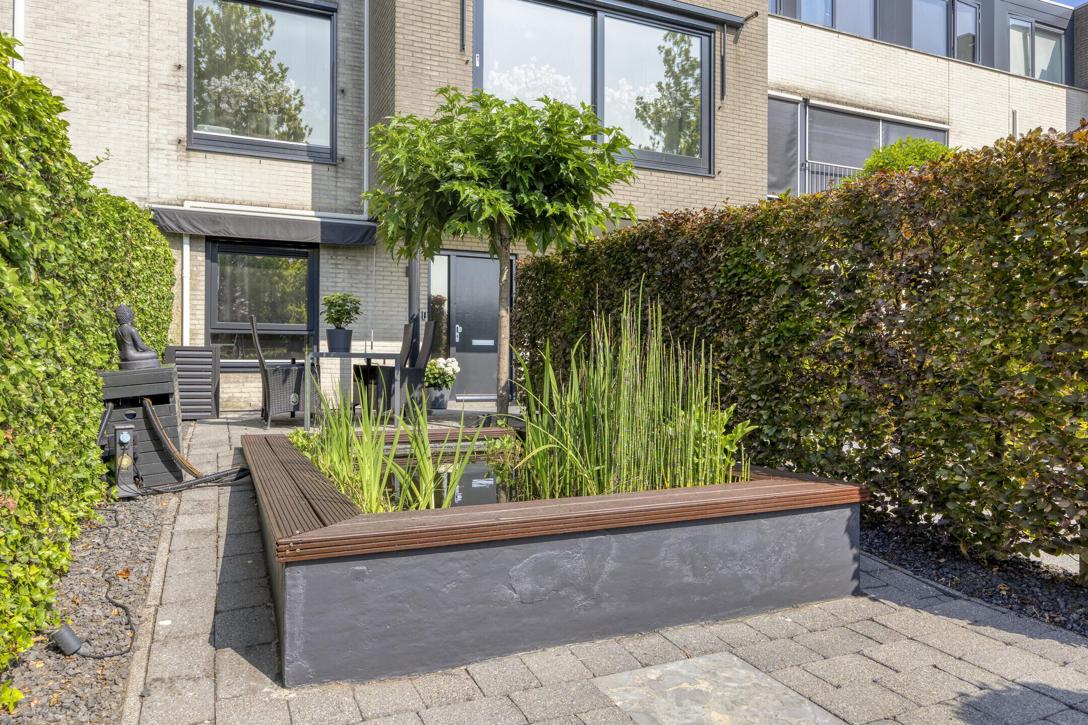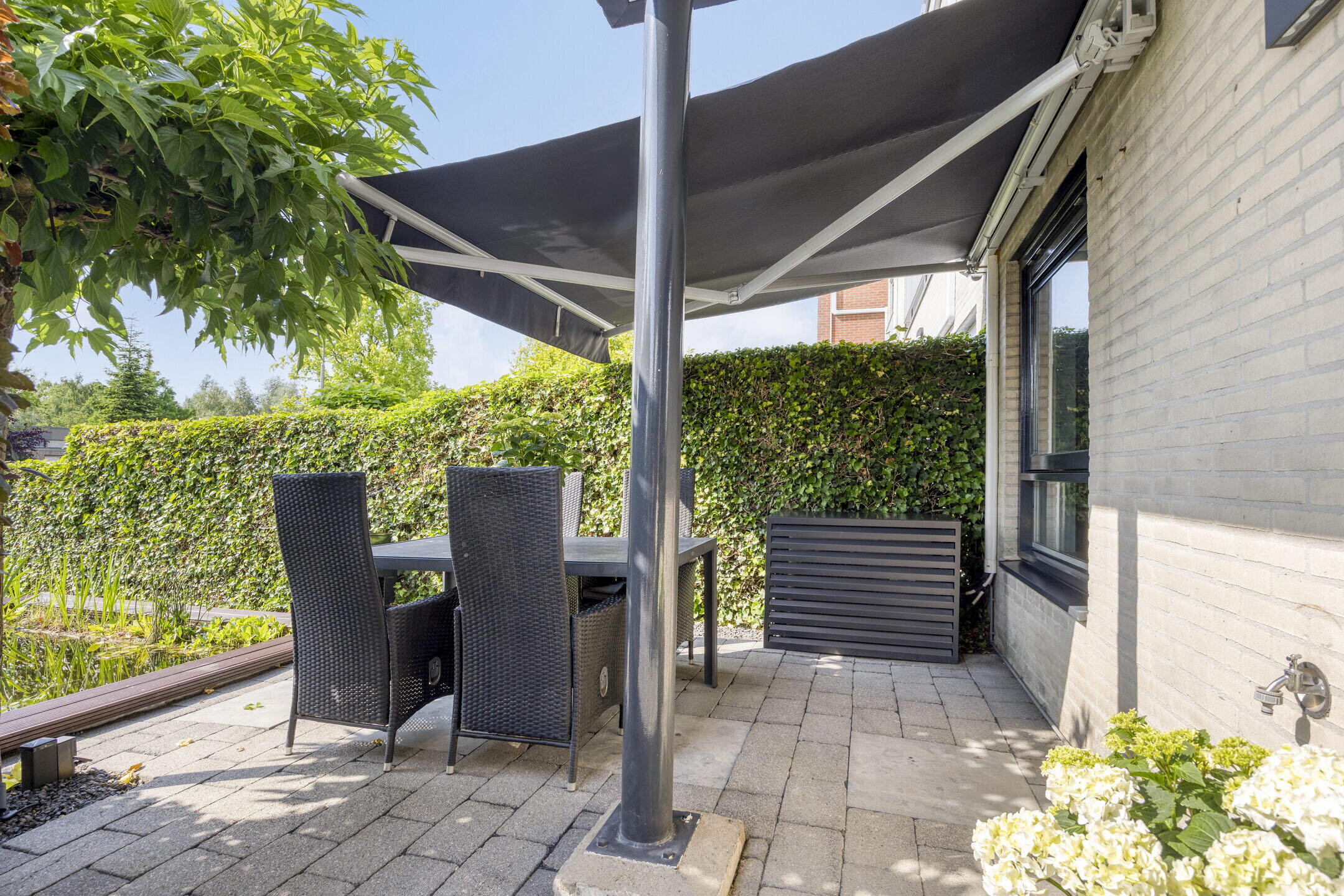 De woning heeft een verzorgde voortuin met een terras voor een zitje of grote tuintafel, een vijver en veel groen. Op de begane grond zorgt een extra zonnescherm voor schaduw op warme dagen. De zonnige ligging maakt het een heerlijke plek om buiten te zitten.